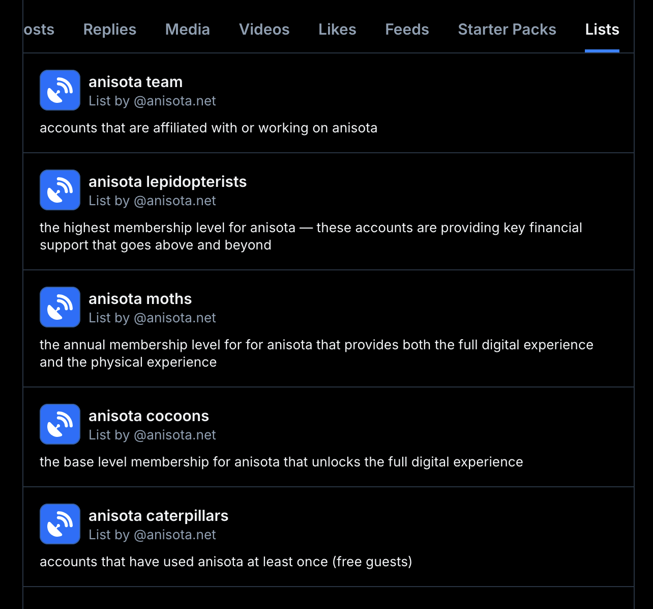 The membership system is rooted in a series of Bluesky Account Lists that were created under the @anisota.net brand account.